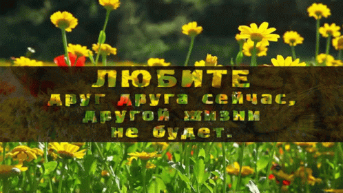 A vibrant field of yellow summer flowers with a Russian quote: 'Love each other now, there will be no other life.'