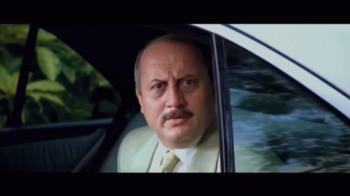 Anupam Kher, from the movie Kaho Naa Pyaar Hai, looks surprised and flushed while sitting in a car.