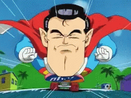 The character 酸梅超人, a parody of Superman, is seen flying on a skateboard with a cape.