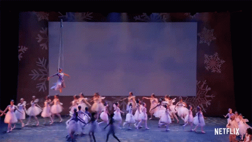 A captivating scene from Dance Dreams Hot Chocolate Nutcracker, featuring a flying ballerina and group ballet performance on stage.