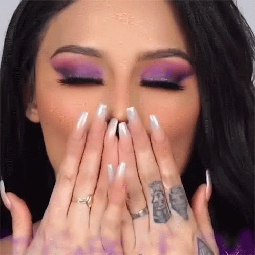 A woman with striking purple eyeshadow and a septum piercing blows a flying kiss to the camera.