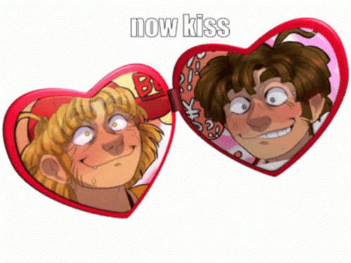 Michael Afton and Jeremy Fitzgerald (Jeremichael/Jeremike) in a 'now kiss' meme with heart lockets.