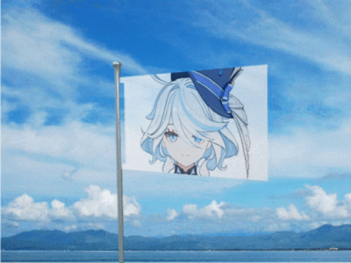 A flag featuring the Genshin Impact character Focalors Anemone Reiri, with blue hair and a hat, waving against a scenic sky.