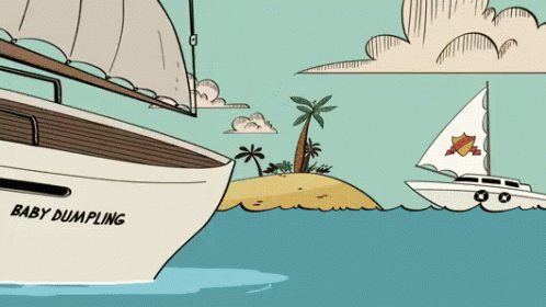 Harold McBride holds Clyde McBride over the water next to the 'Baby Dumpling' sailboat in a scene from Loud House.