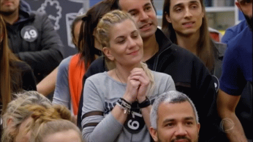 A happy woman with braided blonde hair, wearing a grey shirt with '61', smiles and nods in a crowd.