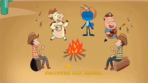 Bob Zoom characters gather around a campfire, playing music and dancing in a Wild West setting.