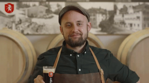 A man in a brewery proudly presents a glass of Fohrenburger Fohra dark beer.