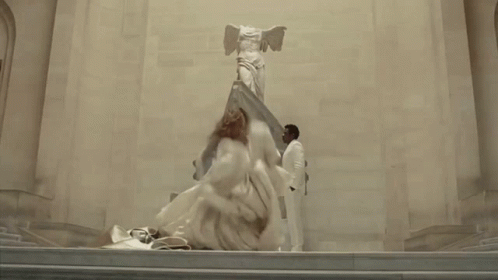A woman in a white dress performs energetic dance moves in front of a classical statue, observed by a man in a white suit.