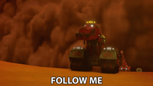 Ty Rux, the Dinotrux character, drives his vehicle through a massive, orange-brown dust storm with 'FOLLOW ME' displayed.