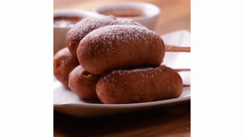 Delicious banana bread on a stick, dusted with powdered sugar, ready to be dipped in melted chocolate and caramel.