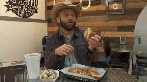 Chet Garner from The Daytripper enthusiastically eats a delicious burger and fries in a diner.
