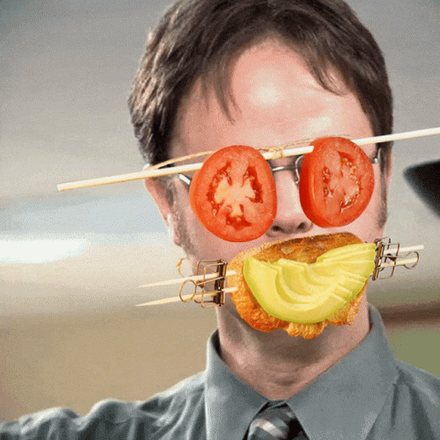 Dwight Schrute from The Office wears a food mask with tomato slices for eyes and avocado for a mouth.