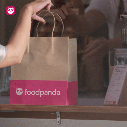 A person picks up a Foodpanda order in a branded bag from a cafe, showcasing the delivery service.