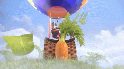 Foodpanda's PauPau character in a hot air balloon, carrying a giant carrot over a grassy landscape.