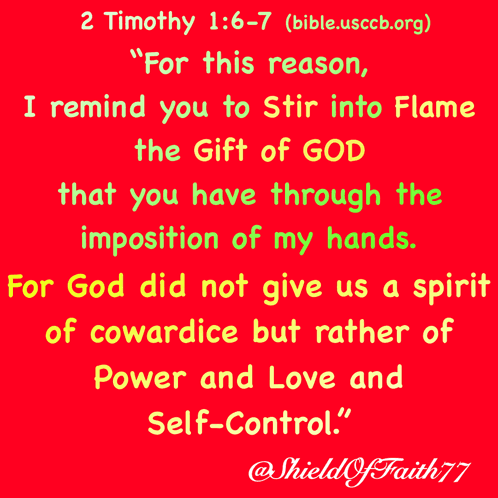 A powerful Bible verse from 2 Timothy 1:6-7, reminding us to stir into flame the gift of God, not a spirit of cowardice.