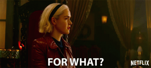 Kiernan Shipka as Sabrina Spellman in 'Chilling Adventures of Sabrina' asks 'For What?' with a questioning look.