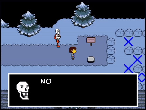 a video game screen shows a skeleton talking to a girl and the word no on the bottom