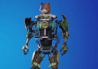 Fortnite character Kit, a cat on a robot's back, performs the 'So Square' emote against a blue background.