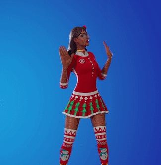 Fortnite character Krisabelle performs a festive dance emote in her red and green Christmas outfit.