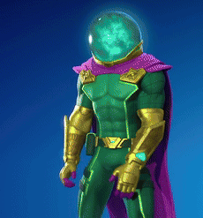 Mysterio from Fortnite performs a facepalm emote, showing annoyance with his signature green suit and glowing helmet.
