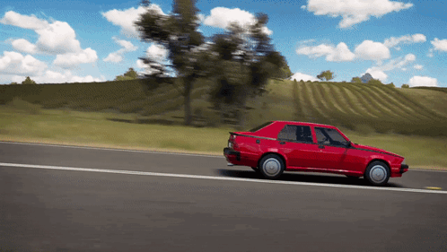 a red car is driving down a road with trees in the background