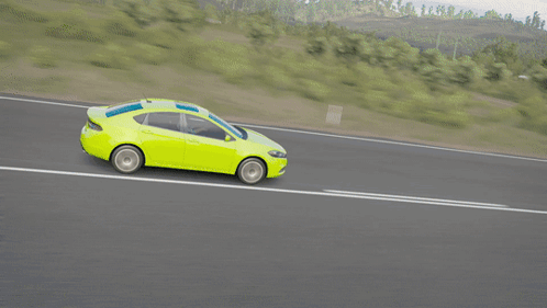 A neon green Dodge Dart GT with a sunroof drives on a scenic road in Forza Horizon 3.