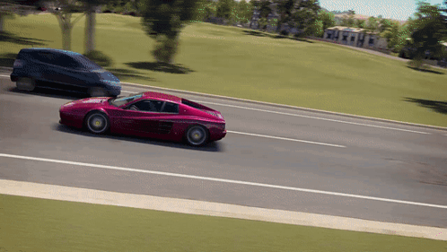 a red sports car is driving down the road next to a blue van