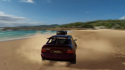 A Ford Escort RS Cosworth rally car drifts and spins on a sandy beach, kicking up dust in the popular racing game Forza Horizon 3.