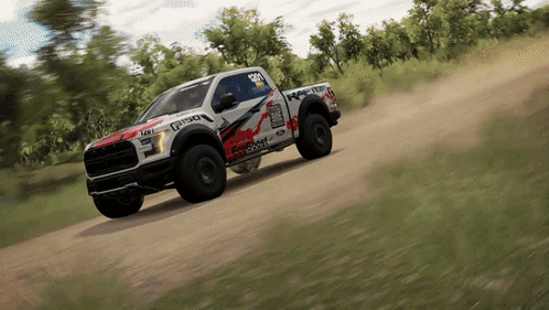 A white Ford F-150 Raptor race truck drives off-road on a dirt track in Forza Horizon 3.