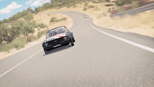 The Hoonigan Ford Escort RS1800 with an American flag hood races through a winding track in Forza Horizon 3.