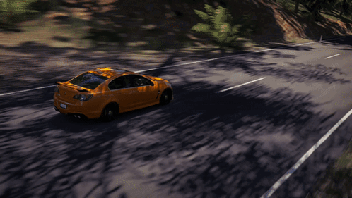A vibrant yellow HSV Gen F GTS speeds through a scenic forest road in Forza Horizon 3, showcasing dynamic driving.