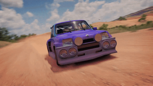 A purple Renault 5 Turbo rally car drifts and speeds across a dusty dirt road in Forza Horizon 3.