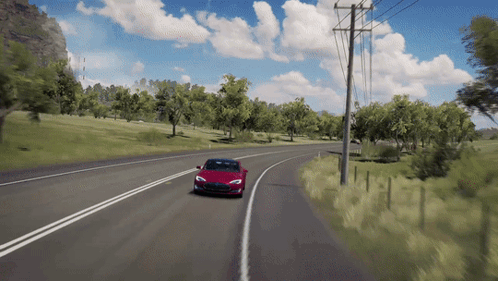 A red Tesla Model S drives dynamically through scenic roads in Forza Horizon 3.