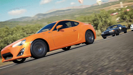 An orange Toyota GT86 sports car races on a scenic road in the video game Forza Horizon 3.