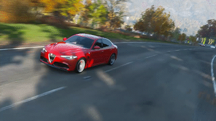 A red Alfa Romeo Giulia Quadrifoglio speeds through a scenic track in Forza Horizon 4, showcasing dynamic driving.