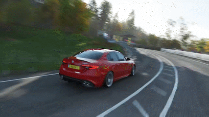 A red Alfa Romeo Giulia Quadrifoglio drives through scenic roads in Forza Horizon 4 gameplay.