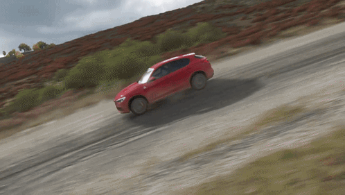 a red car driving down a dirt road with a hill in the background
