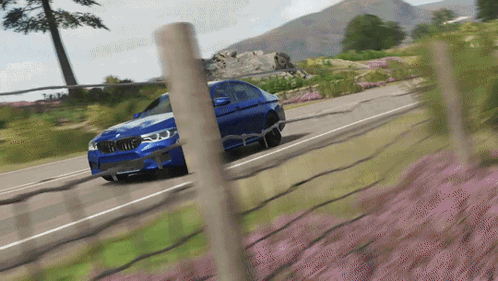 A blue BMW M5 drives through scenic roads in the popular racing game, Forza Horizon 4.