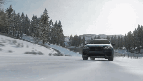 A green BMW X6 M drifts and drives through a snowy landscape in Forza Horizon 4.