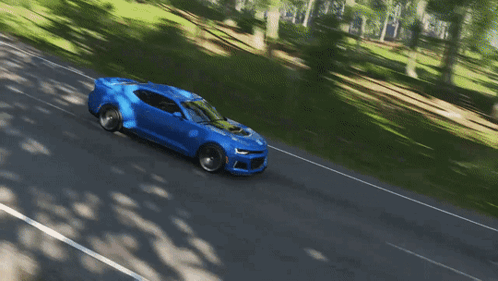 Blue Chevrolet Camaro ZL1 speeding through a scenic forest road in the video game Forza Horizon 4.