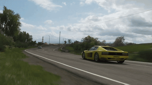Yellow Ferrari 512 TR racing through scenic roads in Forza Horizon 4.