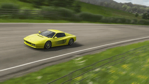 a yellow car is driving down a road