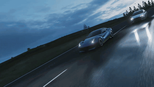 A sleek blue Ferrari F12tdf speeds down a wet road in the popular racing game, Forza Horizon 4, under a dramatic cloudy sky.