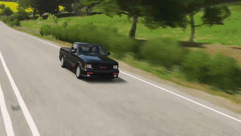 A black GMC Syclone pickup truck drives on a winding road in the video game Forza Horizon 4.