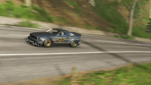 A customized Hot Wheels Ford Mustang races through scenic roads in Forza Horizon 4 gameplay.