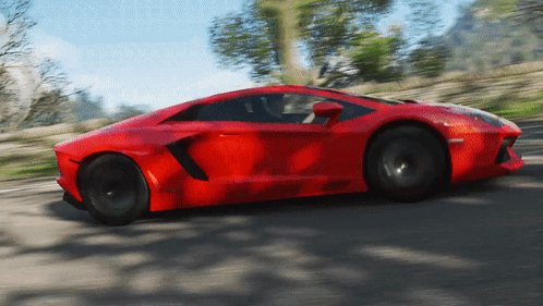 a red sports car driving down a road with trees in the background