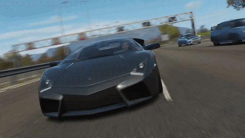 A black Lamborghini Reventon supercar speeds down a highway in the video game Forza Horizon 4.