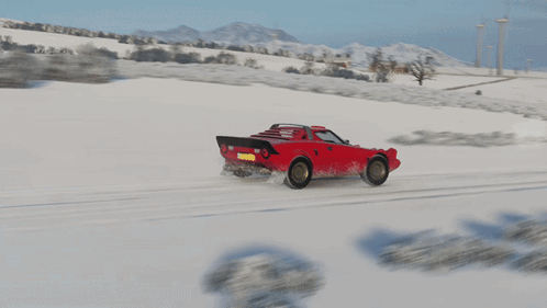 A classic Lancia Stratos HF Stradale drifts through a snowy landscape in Forza Horizon 4.