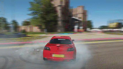 Red Mazda RX-8 R3 performing drifts and burnouts in Forza Horizon 4.