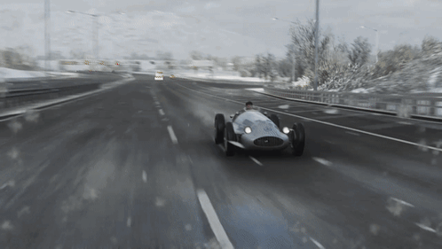 A vintage Mercedes Benz W154 race car driving on a snowy highway in Forza Horizon 4.